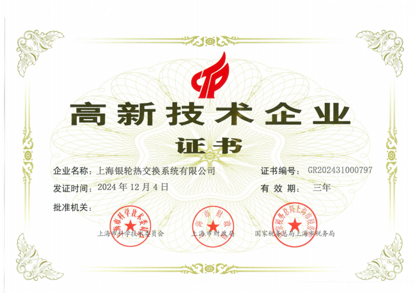 近日,上海银轮热交换系统有限公司(以下简称“上海银轮”)荣获高新技术企业证书。这一重要认证标志着上海银轮在技术创新、研发能力以及自主知识产权等方面的突出表现,为公司未来的发展提供了新的动力,也为行业树立了技术领先的标杆。